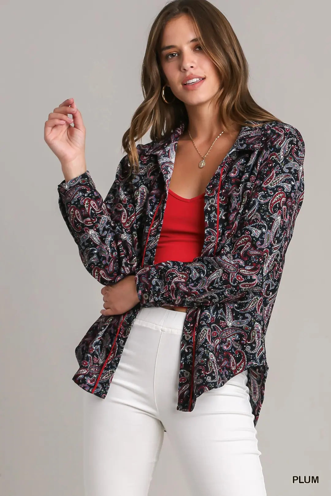 The Briley Button Front combines timeless style with modern flair. This paisley corduroy shirt features a classic collar and button-down front, perfect for layering or wearing solo. The high-low hemline adds an unexpected edge, creating flattering movement and dimension. Soft corduroy fabric feels luxurious against the skin while maintaining durability through countless wears. Versatile enough for casual outings or dressed-up occasions, this piece effortlessly elevates any wardrobe with its unique blend of vintage charm and contemporary design.