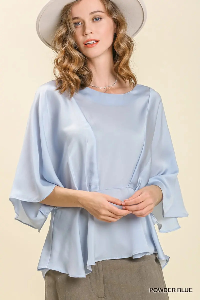 Elevate your wardrobe with the Icee Top, a stunning piece that combines contemporary style with timeless elegance. This striking powder blue top features luxurious satin fabric that drapes beautifully against your skin, while delicate pleats add sophisticated dimension. The graceful kimono sleeves offer a relaxed, flattering silhouette perfect for any occasion, while the charming peplum hem creates a flattering shape that enhances your natural curves. Whether you're dressing up for an evening out or elevating your everyday look, this versatile top delivers effortless polish and undeniable charm.